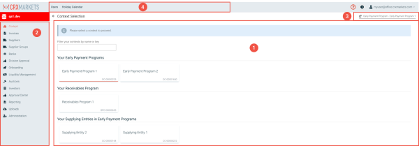 (3) The selected context (program, entity, etc.) appears below the username. Clicking on the selected context takes the user back to the context selection screen, which they already know from the login.