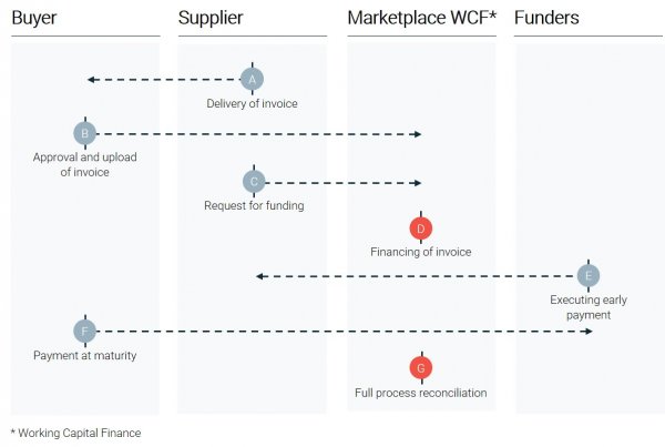 To set up a supply chain finance offering, the buyer enters into an agreement with a digital working capital optimization provider with a supply chain finance or reverse factoring product offering. Once integrated into the digital marketplace, the buyer invites its suppliers to join its own supply chain finance program. They are now connected to the platform as part of a digital onboarding process. Suppliers already participating in another buyer’s existing supply chain finance program can easily join additional programs via an informal invitation and a simple contract amendment. The number of suppliers is infinitely scalable and easy to implement due to the process automation of the integration. The more suppliers follow the same marketplace, the better programs scale from both a buyer and supplier perspective.